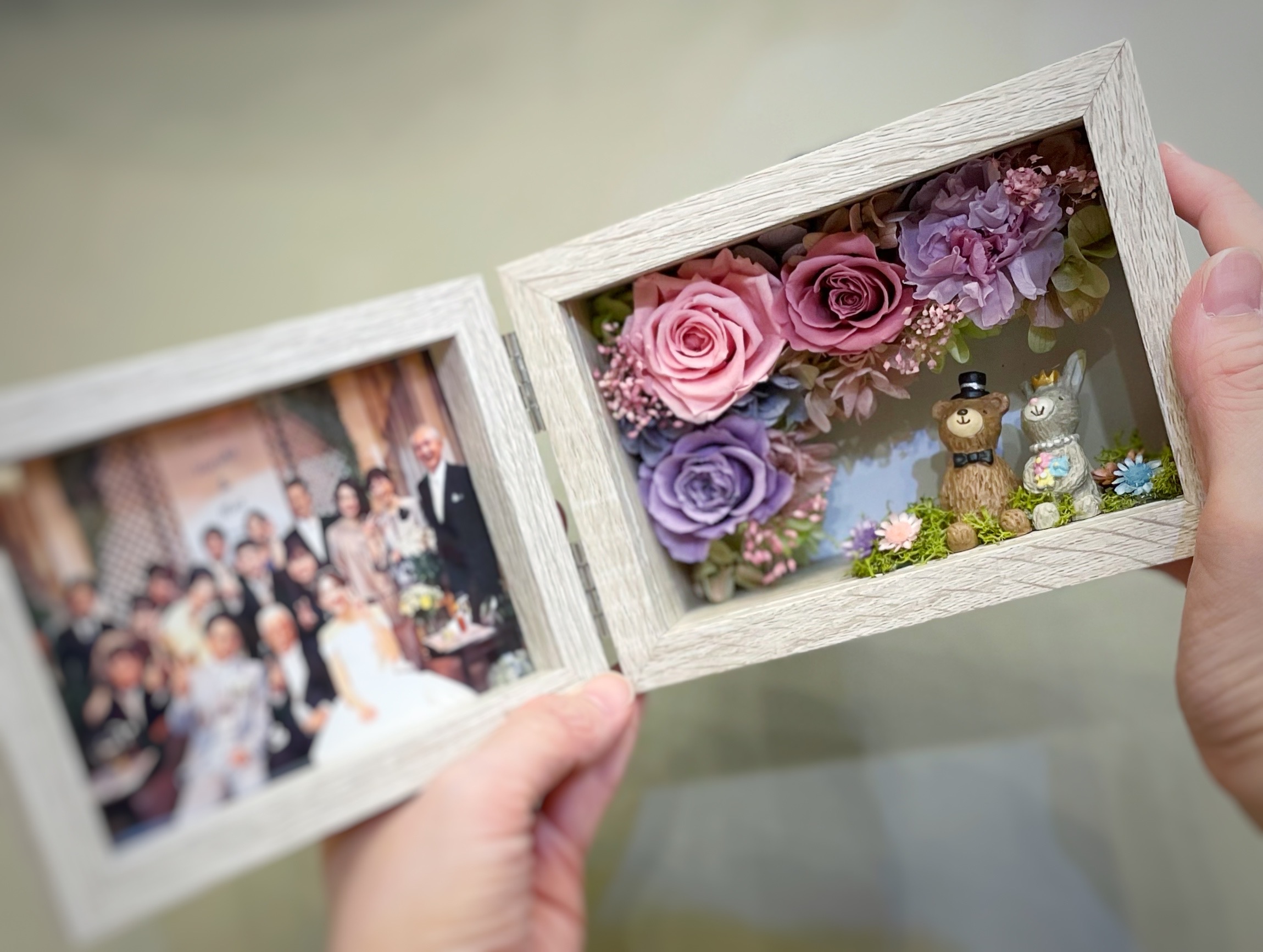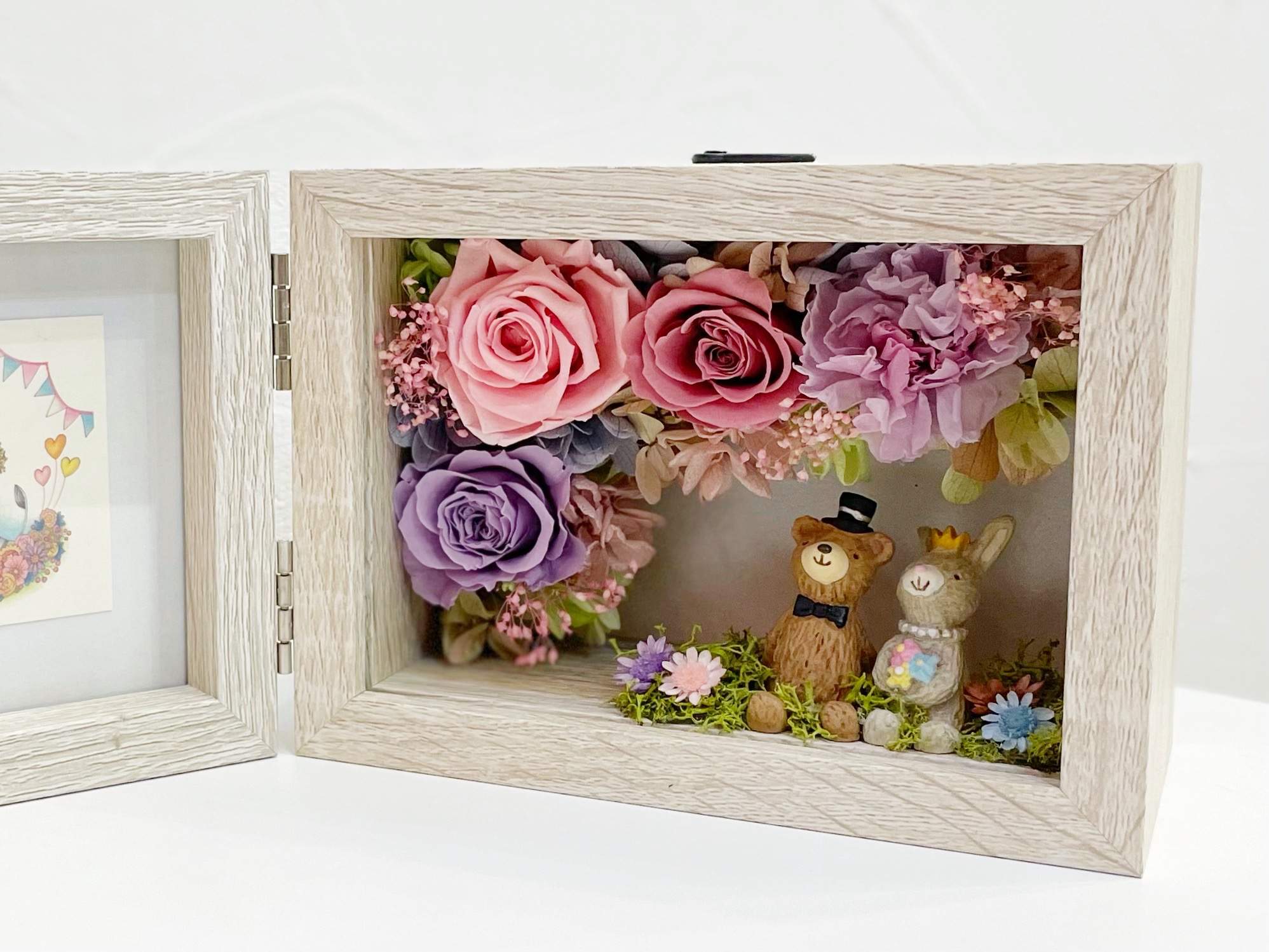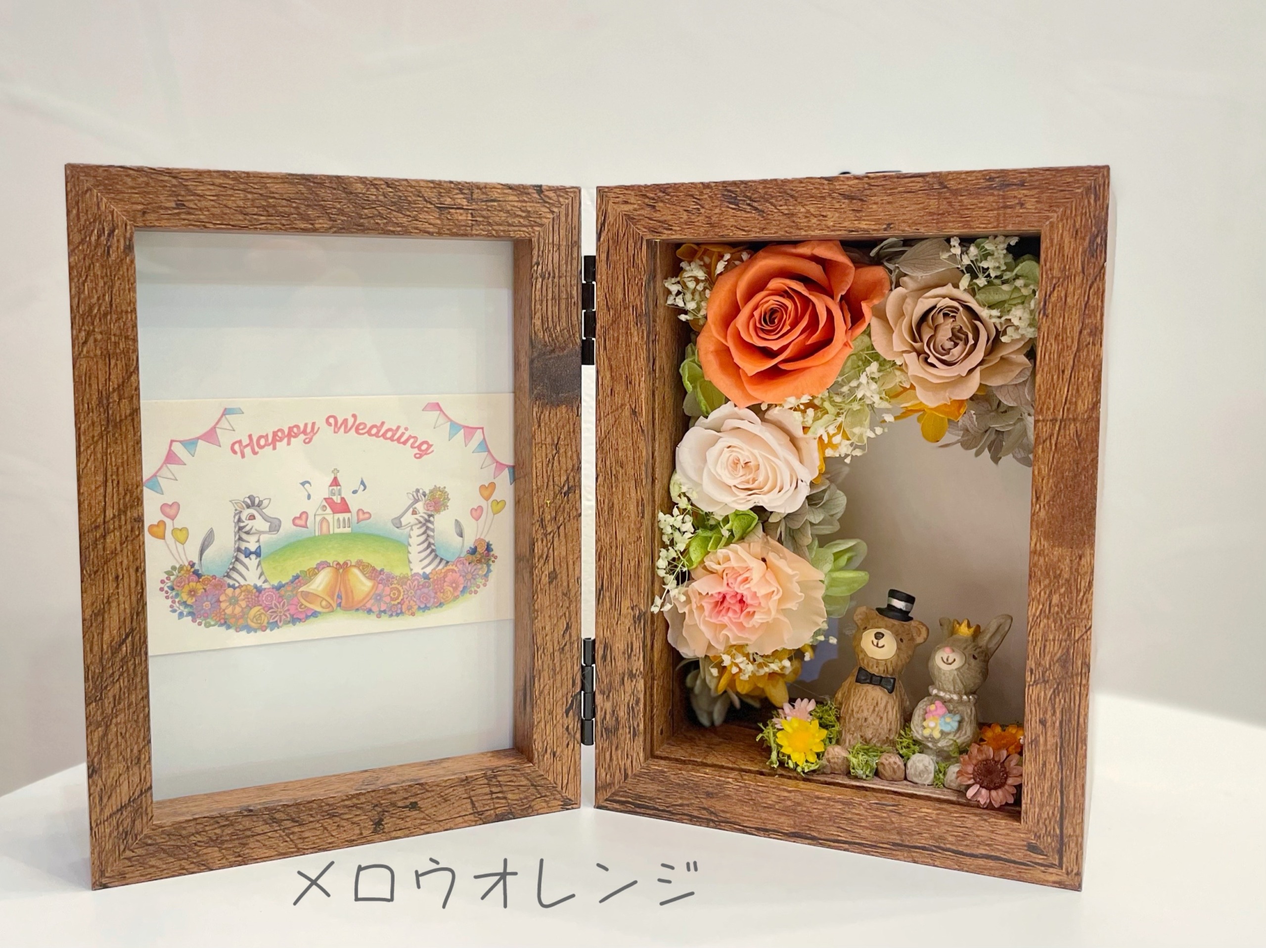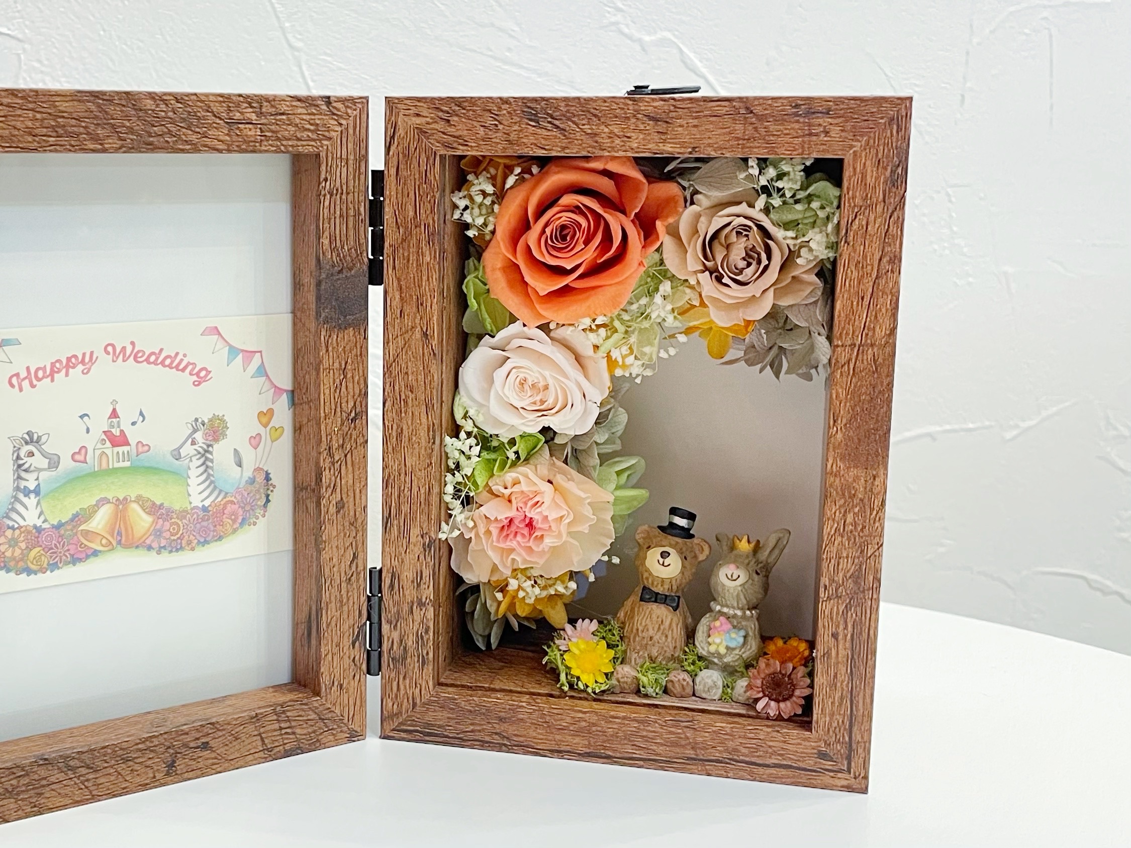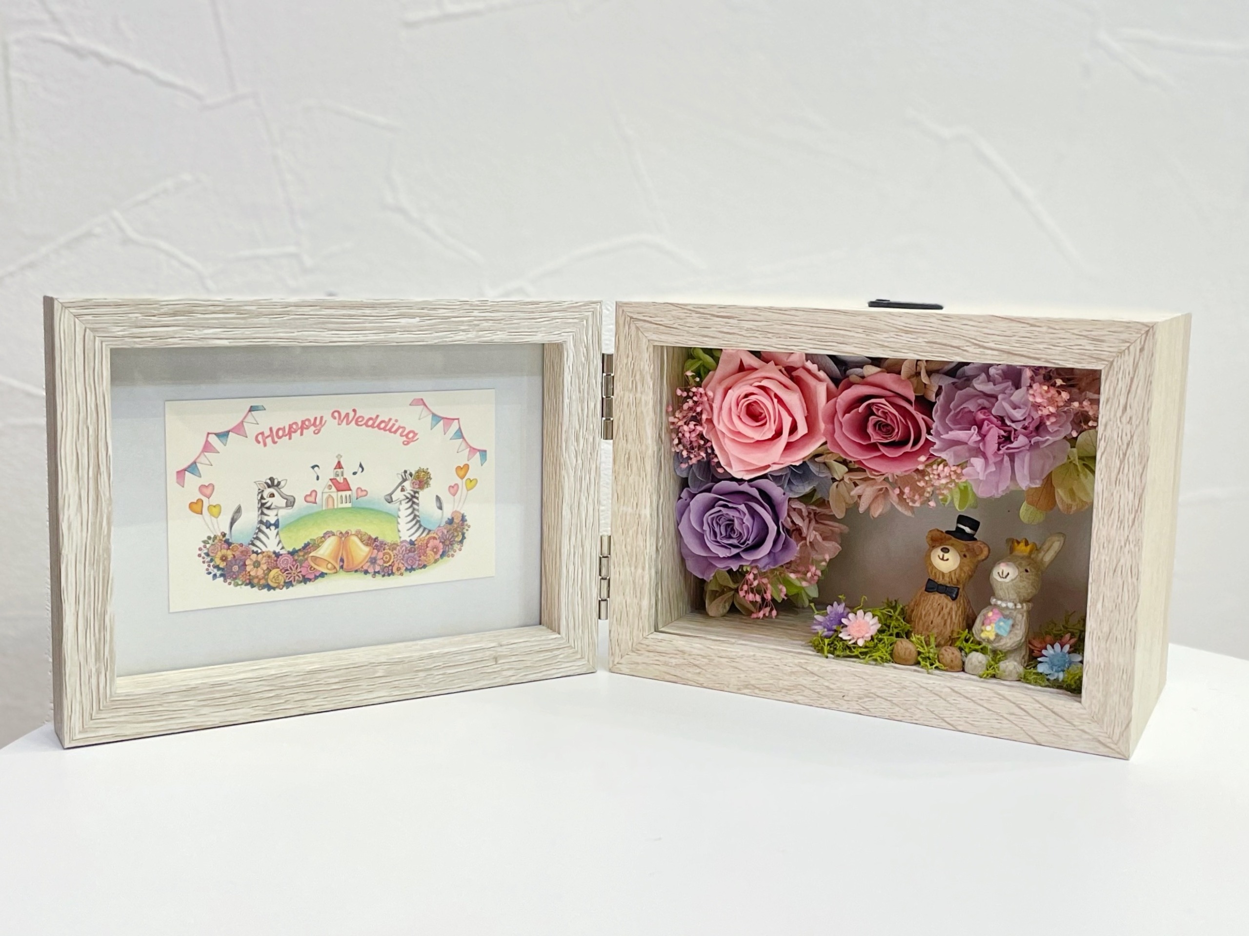 ウエディング仕様のペアアニマルとお花のメルヘンな世界がかわいいフラワーフォトフレームです。