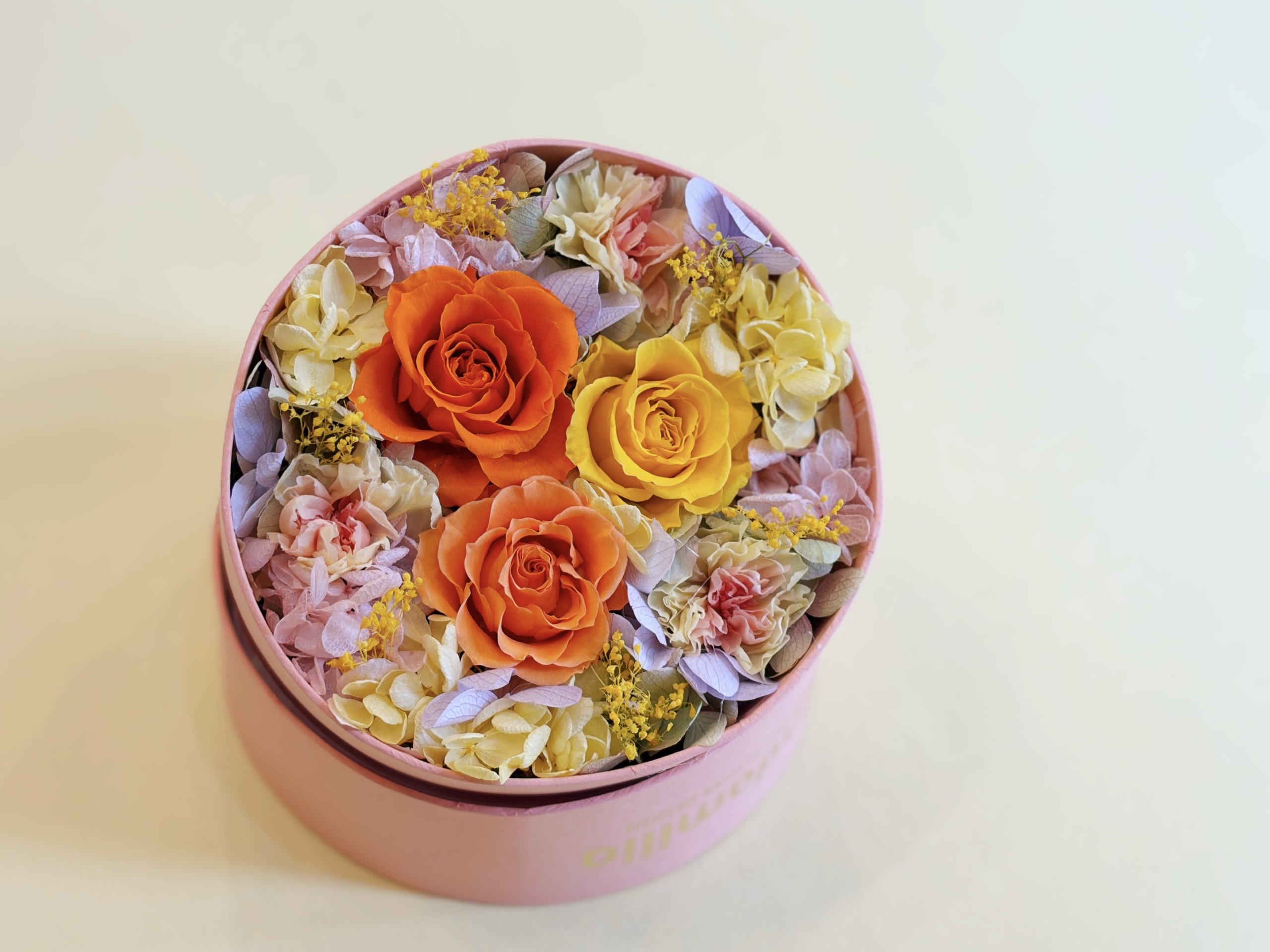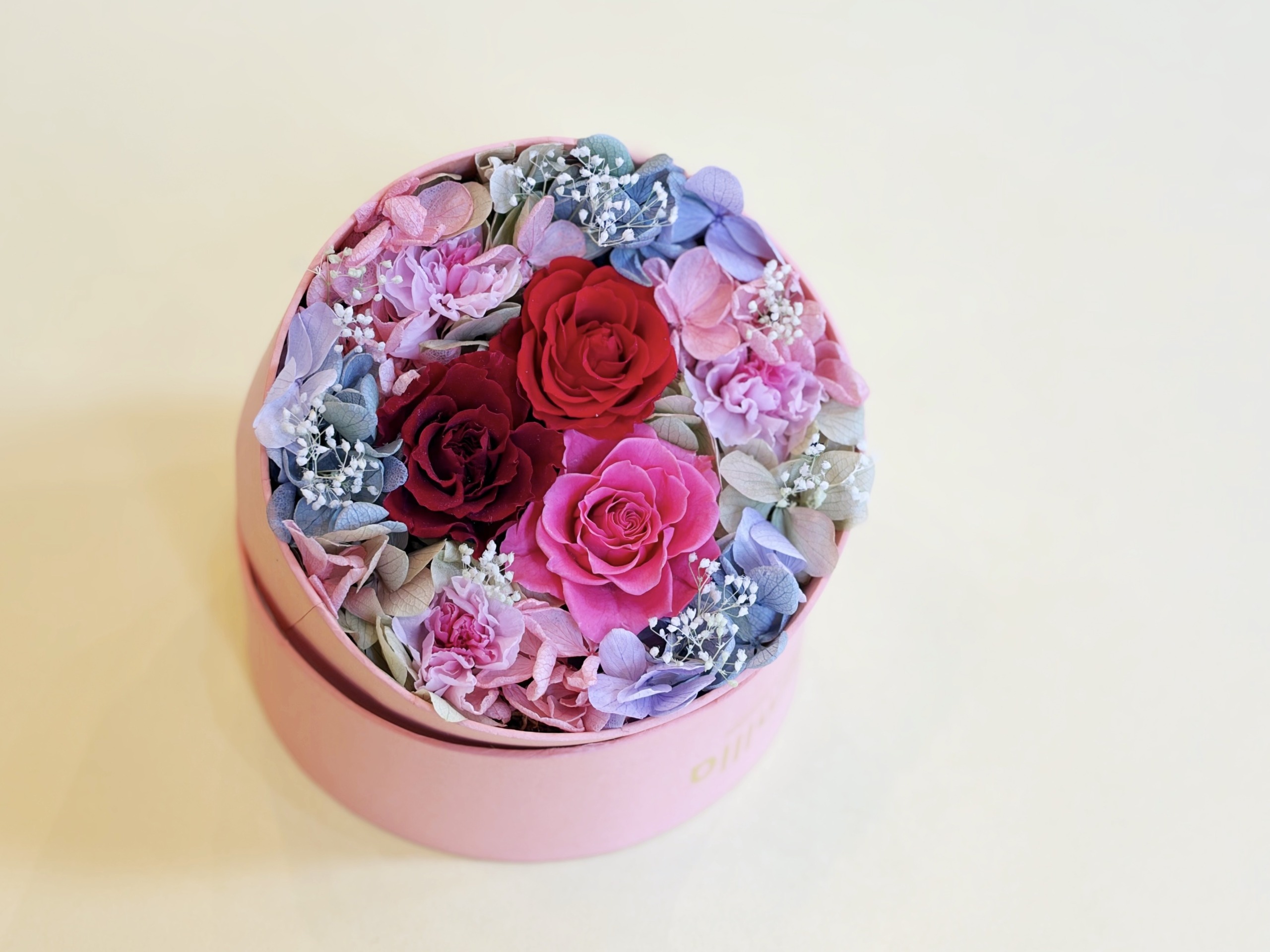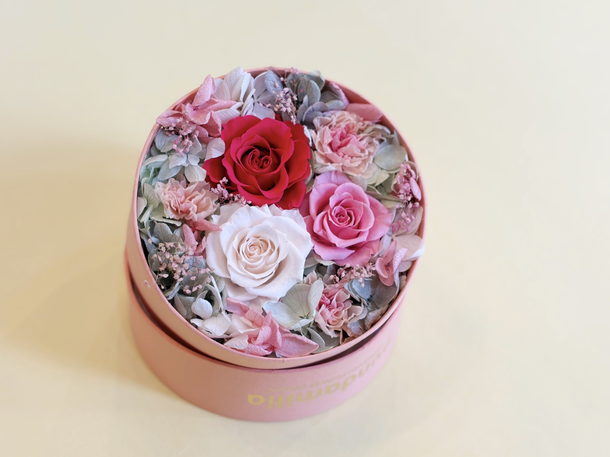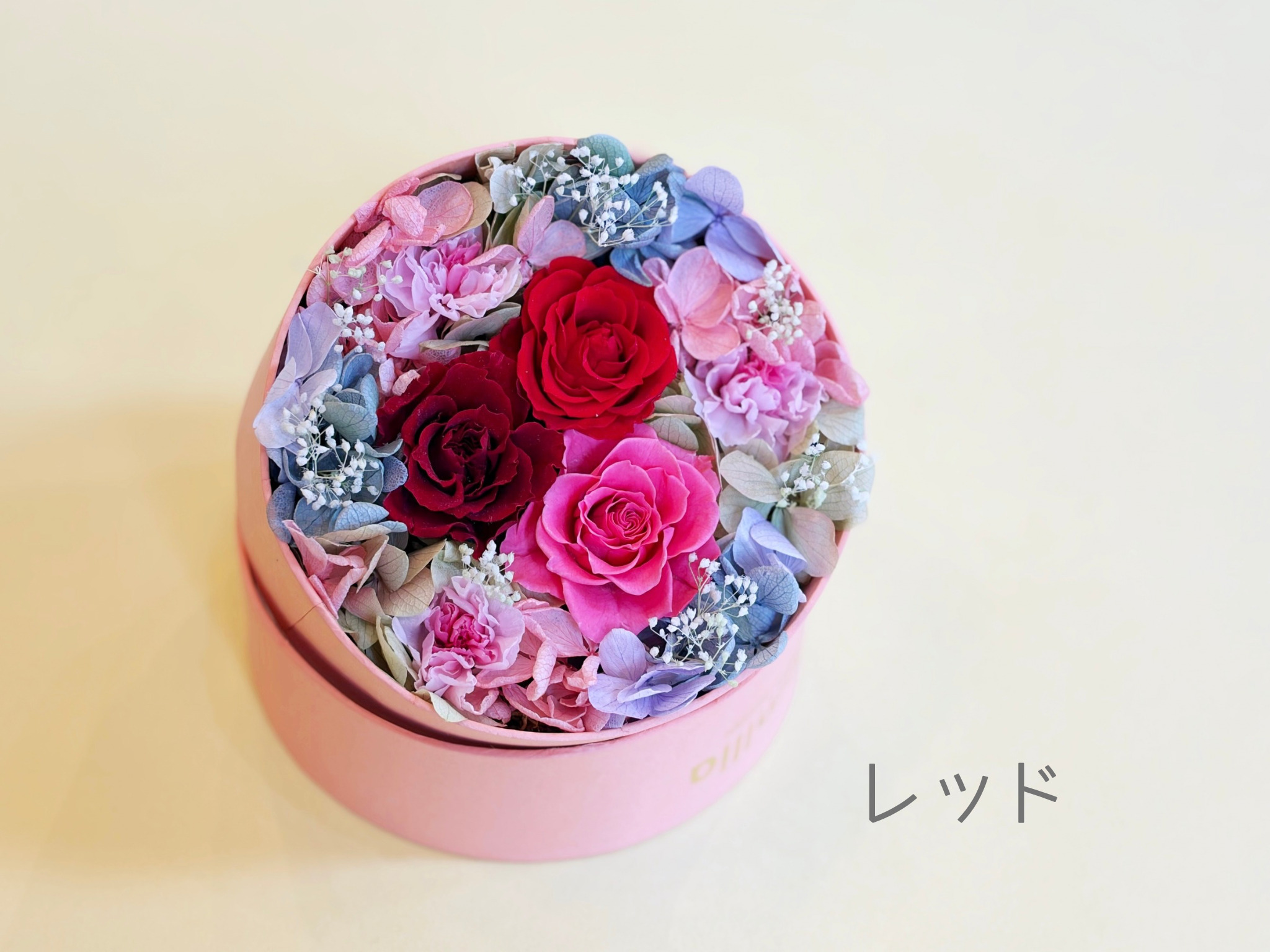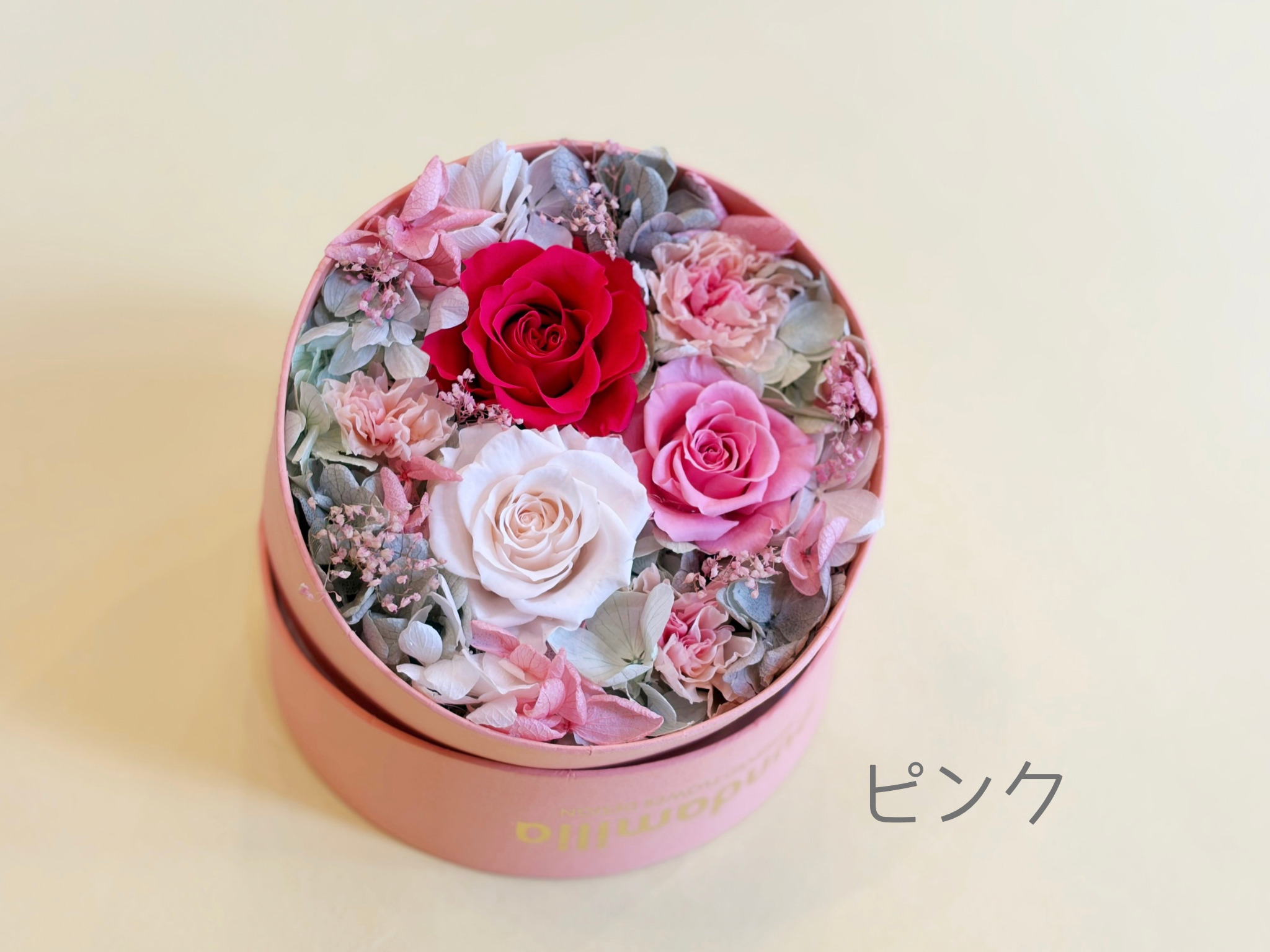 母の日限定のピンク色のハットケース。ふたを開けると色鮮やかなバラとカーネーションが広がります。サプライズプレゼントにもおすすめです。