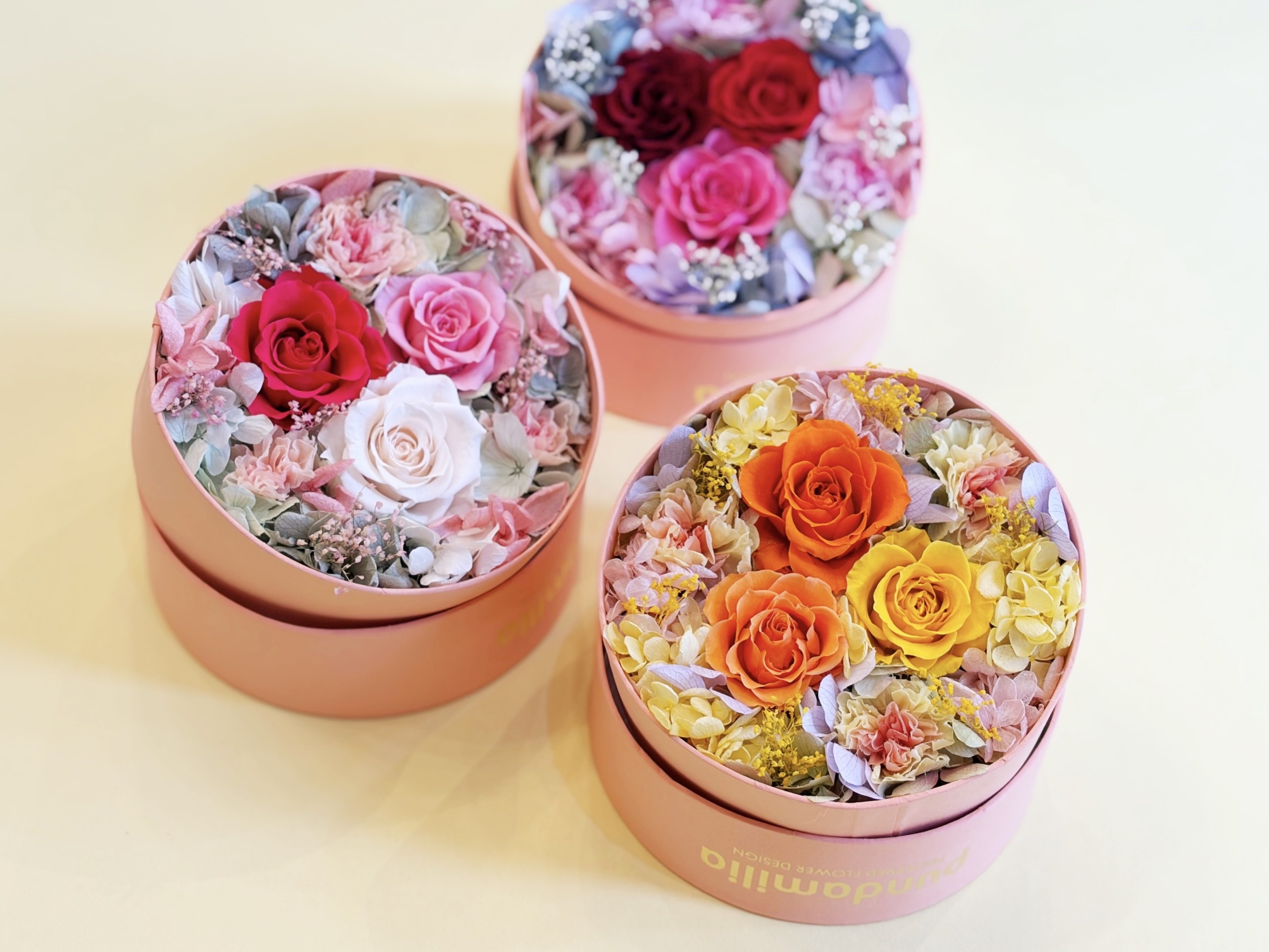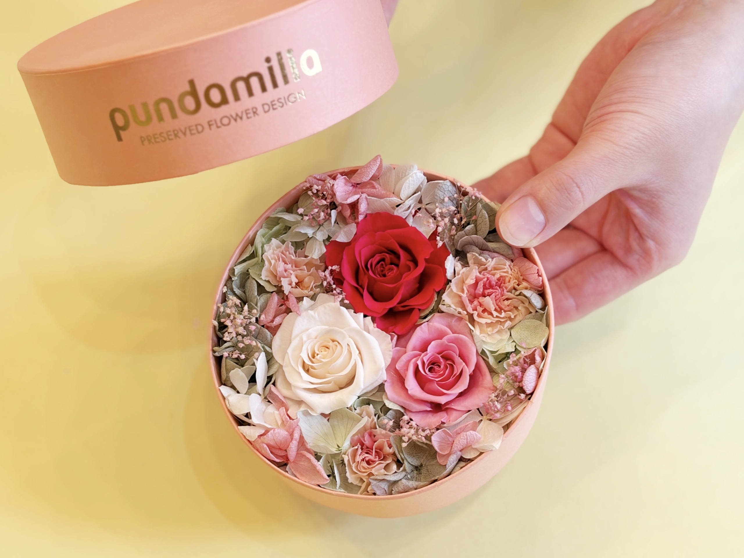 母の日限定のピンクのハットケース。 ふたを開けると色鮮やかなバラやカーネーションが目に飛び込んできます。